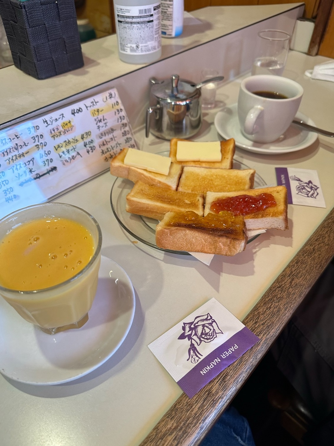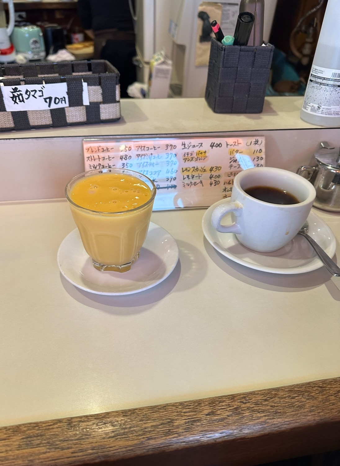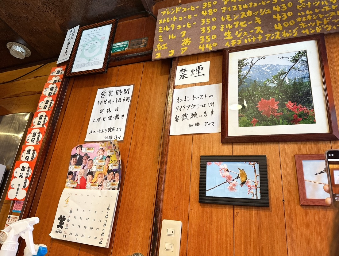 아사쿠사에 위치한 ‘카페 아로마’는 레트로 감성이 가득한 작은 카페예요. 이곳은 노부부가 운영하는데, 제가 갔을 때는 할아버지께서 혼자서 응대하고 계셨어요. 카페는 바 형태로 되어 있어서 자리가 많지는 않았는데, 운 좋게도 친구와 제가 갔을 때 딱 두 자리가 남아있어서 바로 앉을 수 있었답니다. 이곳은 단골 손님이 많은 것 같았고, 분위기가 참 따뜻했어요. 하지만 한 가지 단점이 있다면, 흡연이 가능하다는 점이에요. 이 점은 조금 불편했지만, 이곳만의 매력이 더 크기 때문에 참을 수 있었어요.